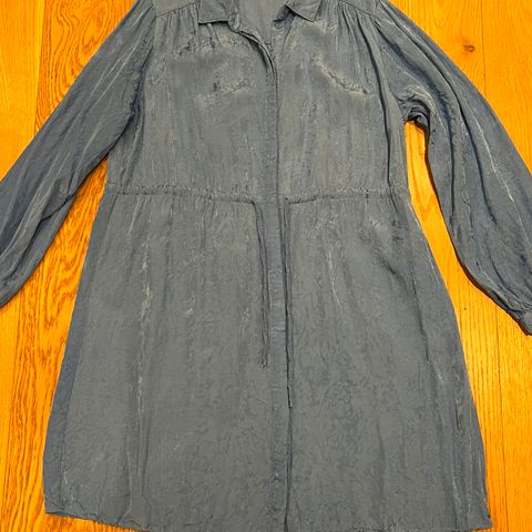 Kjempefin og lite brukt kjole fra Selected Femme i str 38. Den er blå med grønt og litt sort mønster. Knapper. Fin fasong, rynking med strikk i livet bak. Ingen skader eller flekker. Ingen nupper. Ser ny ut.