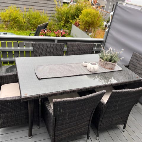 Taigaen spisegruppe, pent og lite brukt. Stått i vinterhage beskyttet for vær og vind. Aldri stått ute. Litt solbleking øverst på 3 puter ved vindu - ellers ingen synlig slitasje. Stoler kan legge ned ryggen - denne funksjonen er i liten grad brukt pga plassmangel der møblene står. Bordlengde kan justeres fra 210cm til 160 cm.