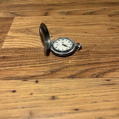 Revue lommeur i sølvfarget metall. Klokken har en klassisk design med tall og en sekundviser. Egnet for daglig bruk eller som en samlergjenstand.