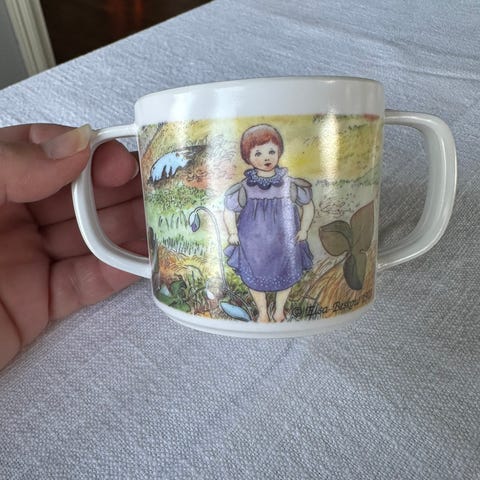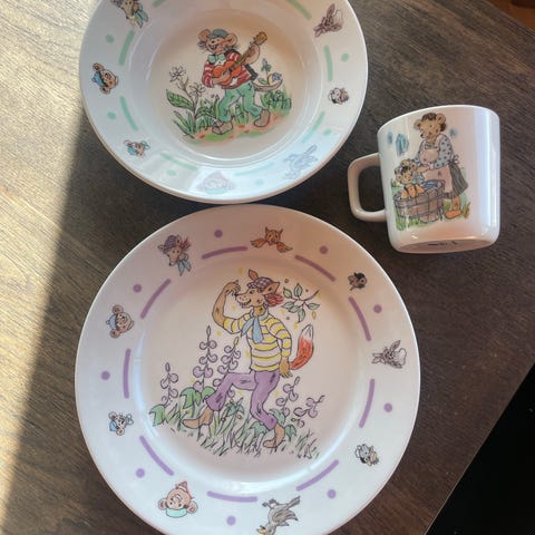 Elsa Beskow tallerk (2 stykk) og kopp. Dishwasher og microwave safe. Vi har kun vasket settet for hånd.