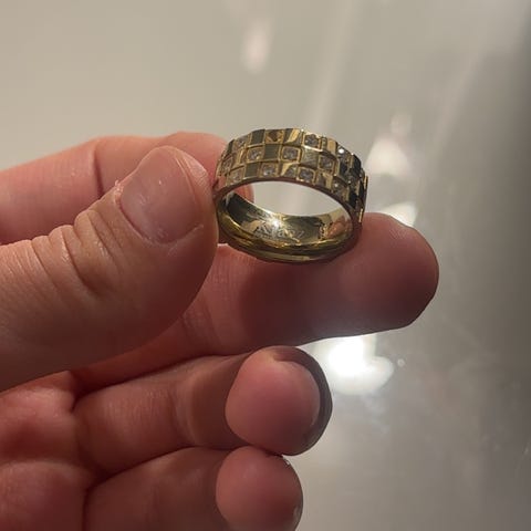 Tung ring fra Dyrberg/Kern. Det står «Success is my middle name og ringen er pyntet med zirkoner rundt hele.