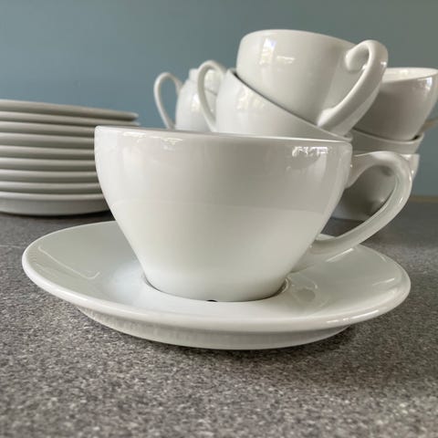 Disse mellomstore koppene passer til både kaffe og te. Høyden på koppene er 6,5 cm, diameteren 9,7 cm. Skålenes diameter er 16,5 cm.