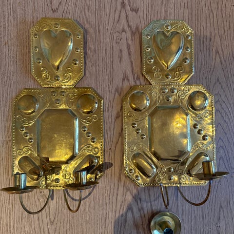 Klassisk messing lysestake med håndtak og fat, kjent som kammerslysestake. Perfekt som dekorasjon, til levende lys, eller som et nostalgisk innslag i interiøret.