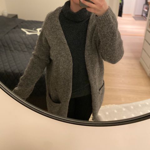 Lite brukt Cardigan i «metall» med hekte foran. Lekker over svart og grått.