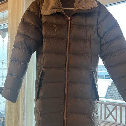 Rød kort boblekåpe i str. 40 fra Days Like This selges kr. 250.- Den har 3 lommer ( 2 ytterlommer og en innerlomme), glidelås og en hette som kan tas av. Fyllet er 90 % andedun og 10 % fjær.