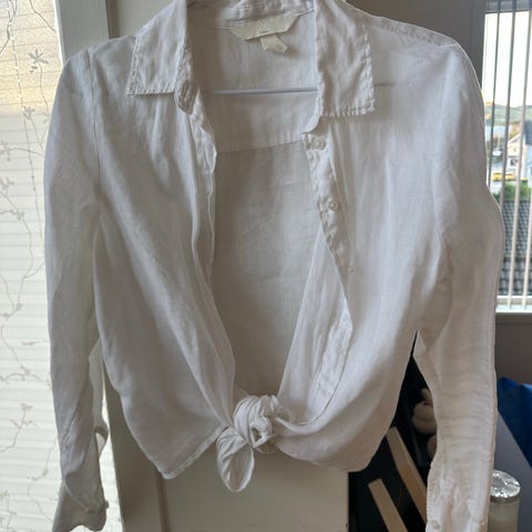 Utrolig fin, men trenger noen forsterkninger med nål og tråd noen steder. Men kun rundt/på allerede sømmer. Ingen hull midt på skjorten. Den er veldig krøllete, og trengs også strykes. Dette er vel litt typisk for lin. Jeg har ikke tid til det, så denne skjorten søker et godt hjem som har tid til den 🤩 I retur får du en nydelig skjorte med mange fine detaljer til en slikk og ingenting: