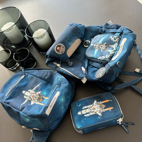 Skolesekk, gymbag og 3 etasjes penal til 1-3 klassing. Du må fylle penalet selv. Gymbag er så godt som ubrukt. Skolesekk er i god stand, med bruksmerker. Det er litt lærertyggis inni en lomme jeg ikke får bort, se bilder. Trenger nytt batteri i lykt. Én spenne er halv, men funksjonen er inntakt. Regntrekk er med. Hentes i Drammen, på Nationaltheatret stasjon, eller sendes. God skolestart!