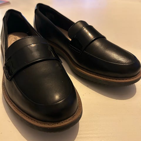 Sorte pene sko fra Clarks i størrelse 5,5, som betyr 38,5 i norske mål. De er svært lite brukt fordi ble for små til meg. Dyre i innkjøp. Jeg sender dem gjerne til deg.
