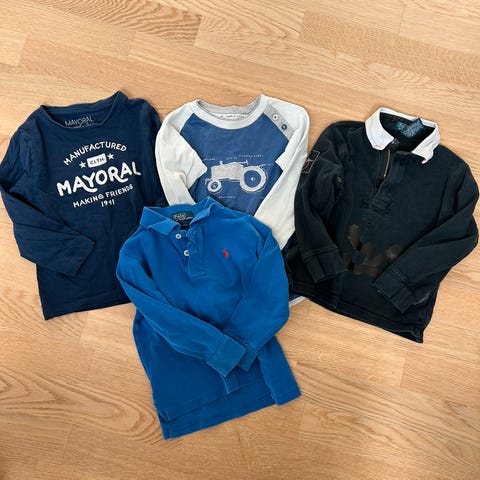 To lite brukt t-skjorter str 110/116. Godt brukt genser str 98/104 men stor i størrelsen (lengre enn t-skjortene) så her ble alt brukt samtidig i 5-6 alderen. Noen små røde flekker på genserermet.