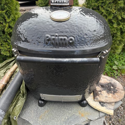 Det medfølger kullstarter og bord med hjul slik at grillen enkelt kan flyttes rundt