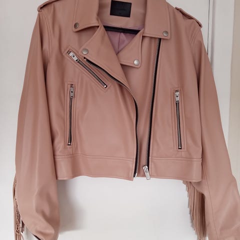 Peacebird Cherry Bomb jakke for dame i størrelse M. Jakken er svart og beige med et brodert emblem foran og teksten 'CHERRY BOMB' bak.ekte skinn.