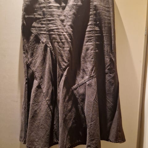 Brunt semsket skjørt med kappe nederst. Lenger bak enn foran. Skrå lengde foran som i en v.