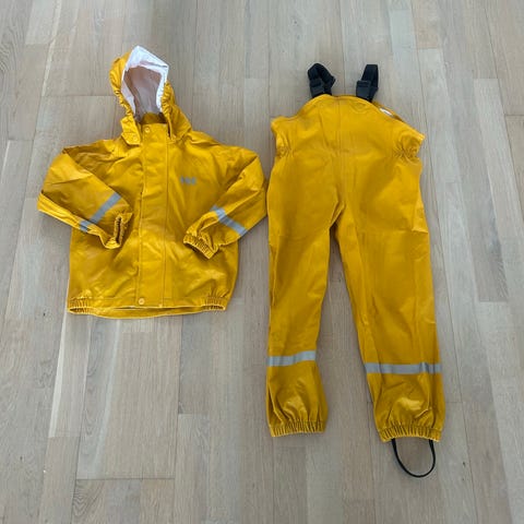 Helly Hansen regnbukse og regnjakke, størrelse 116.