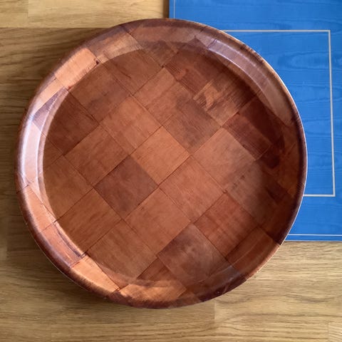 Komplett retro salt og pepperbøsse i teak og porselen med holder i teak selges. Fremstår helt og pent.