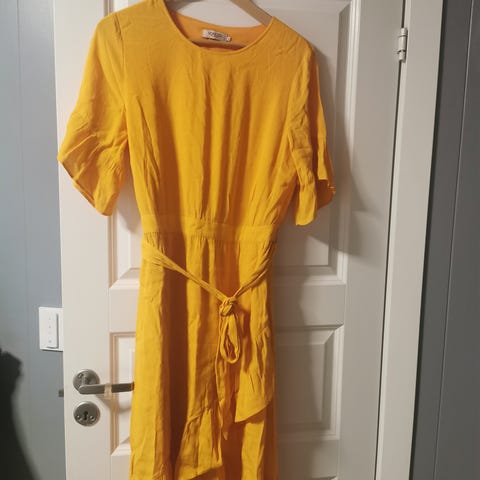 Oransje wrapkjole fra Jean Paul i størrelse XXL. Beltet i livet gjør at kjolen er noe justerbar i størrelsen og flatterende for figuren. Brukt to-tre ganger. Kjolen er litt gjennomsiktig, så en enkel underkjole er å anbefale. Jeg selger også den samme modellen i mørkeblå.