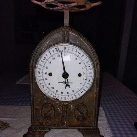 Gammel vippe, balansevekt i tett skap. Messinglodd fra 5 mg til 100 g følger med.