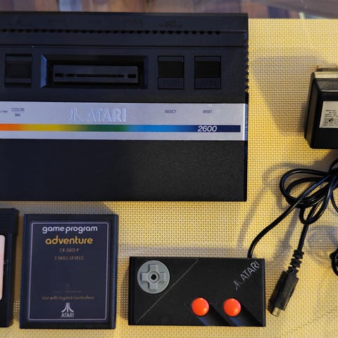 Atari spill med 5 kontrollere og 7 spill til salgs. Atariboksen virker ikke og må repareres.