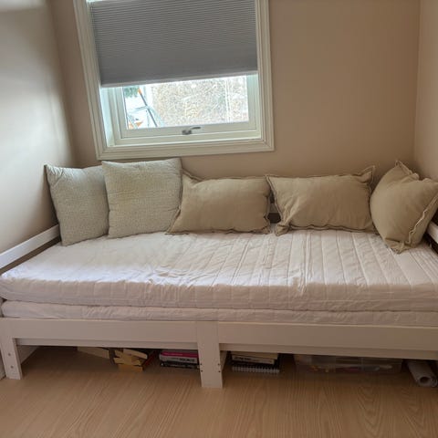 Ingen bruksmerker eller slitasje da den har hatt madrassbeskytter på seg. Trekket er avtagbart og kan vaskes.