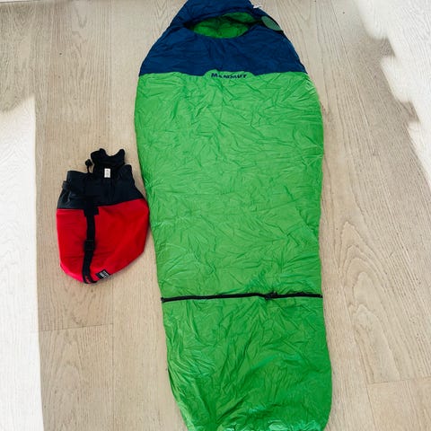 Pent brukt Vikafjell sovepose blå og grønn. Posen er hel og fin. Nyvasket. Mål 170*65*50 cm. Kompresjonstrekk følger med.