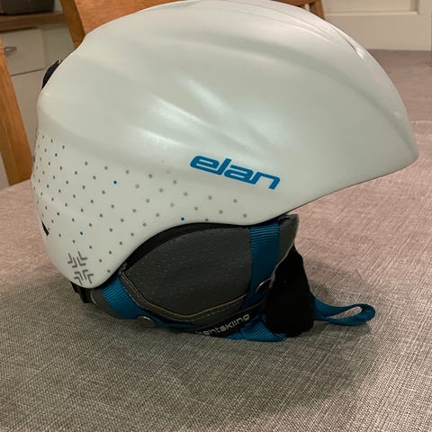 Elan skihjelm, hvit men med Elan logo i forskjelligefarger, unisex, Str 52-56cm, med brilleholder, og luftehull for ventilasjon. Brukt et par ganger.
