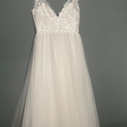 Brudekjole fra JJhouse. V-hals og åpen rygg. Litt slep. Veldig fin i stoffet og tyllet.