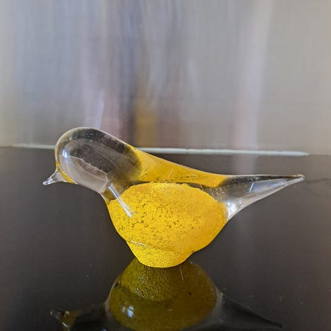 En vintage figur i glass, Mike Mus. Høyde ca 10 cm. Den er gul på baksiden slik at fargen skinner gjennom glasset. Noe farge er borte, men ellers er den i god stand.