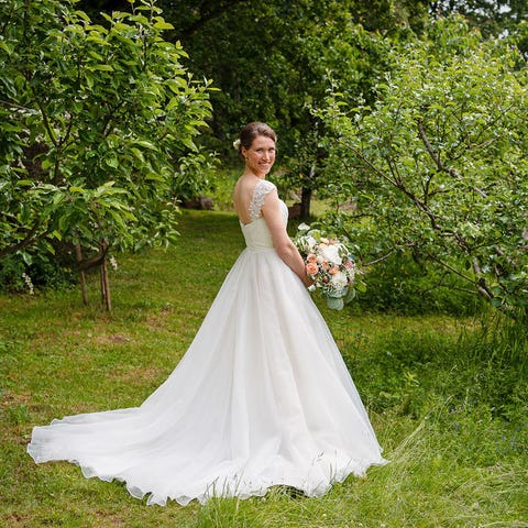Vintage kjole kjøpt hos Helena Vintage, hatt den til skredder og tilpasset meg. Planla å gifte meg i den, men endte med et spontan kjøp av ny kjole rett før bryllupet. Hadde tenkt å bytte til denne underveis i festen, men slik ble det ikke.