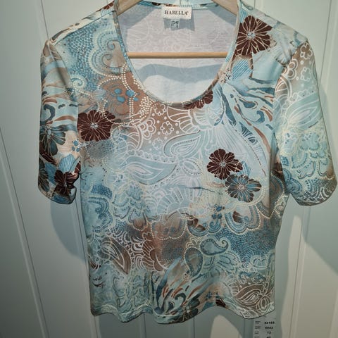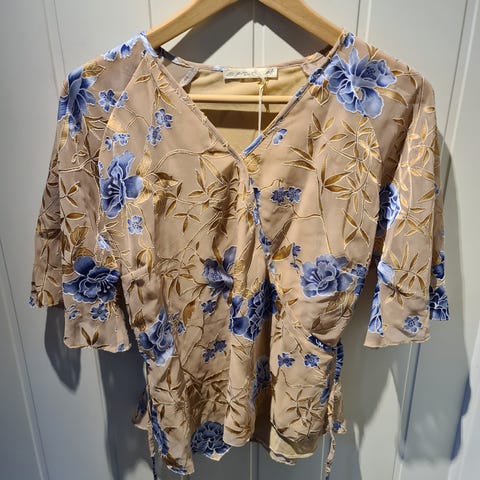 Flott og elegant topp fra Sabela i størrelse 40, med v‑utringning og lekkert broderi i blå- og bruntoner. Delikat stoff i chiffong med et lett og feminint uttrykk. Plagget er helt nytt og ubrukt, med original merkelapp.