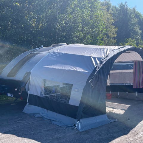 Meget pent markise fortelt til Fiamma markise, 4,0 m eller 4,5 m. Selges med gardiner og innvendig Fiamma teppe.
