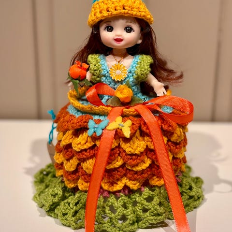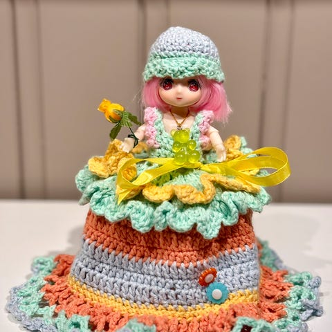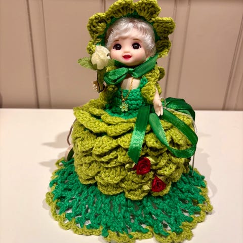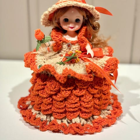 Søkeord: Håndlaget Retro Gammeldags Heklet Hekling Dukke Dokke Dorull Toalett Bad Pynt Håndarbeid Fargerikt Hjemmelaget Kjole Gaver