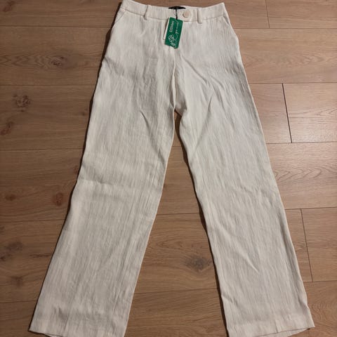Info om buksen: Dressbukse i semi-stretchy vevd materiale med mid low midje. Dressbuksen har ben med press og noe utsvingt nederst (flare). Linning med hemper, knapp og glidelås på fremsiden. Buksen har to passpolierte lommer bak. Normal lengde og normal passform. Kan oppleves liten i størrelsen. Størrelse 48.