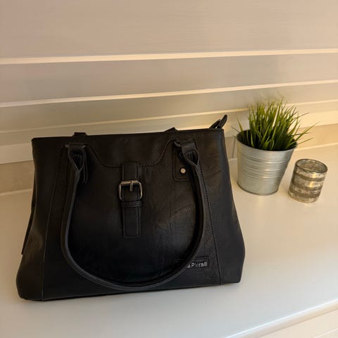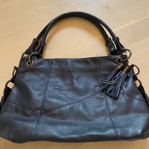 Kul og litt annetledes veske med form som en sylinder. Målene er 14 cm bredde og 10 cm høyde.