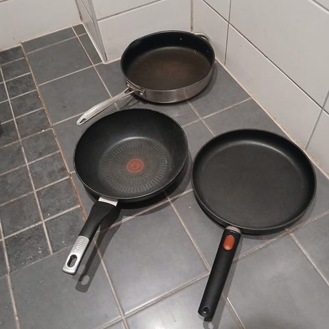Pent brukte stekespader i hardplast selges samlet eller separat. Pris per stk er 50 kr. Pris for alle er 100 kr.