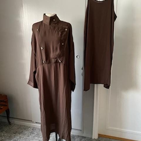 Lite brukt litt stort for meg. Lommer begge siden, veldig behagelig stoff. Målene: skulder: 42 cm. Under armene 57cm lengde 85cm. Lett stoff.