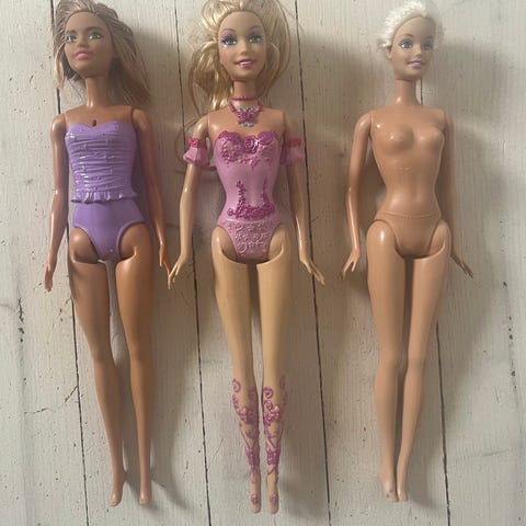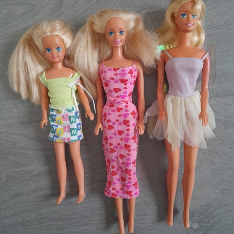 Barbie dukker og en My scene gutt. Klassisk design med bevegelige ledd, egnet for lek og samling. Perfekt for barn som liker å skape fantasifulle historier.