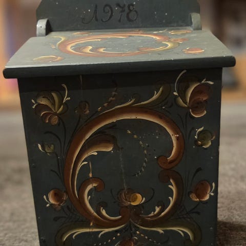 Liten mjølkar: Gammelt mjølkar. Mål: H: 32 cm. D: 21 cm, B: 22 cm. Selges 400kr.