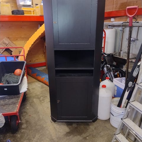 Stilig vintage hjørneskap. Lys i delen med glassdør. Her trenger nok ledningen å byttes til dagens standar. Helt og pent.