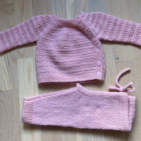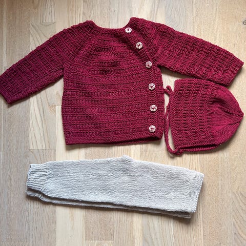 Hjemmestrikket babysett som består av jakke, bukse og lue strikket i Sandnes Sunday garn selges. Settet er nystrikket og ubrukt og kommer fra et røyk og dyrefritt hjem. Str 3-6 mnd og heter Sorgenfri fra Indiblomst.