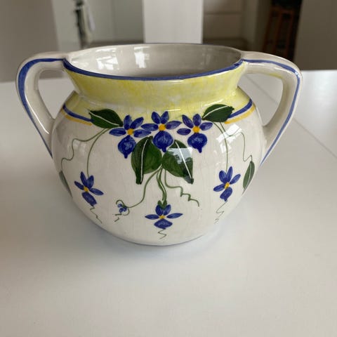 vase krukke selges med blomstermotiv. den er 12 cm i diameter oppe og 15 cm høy