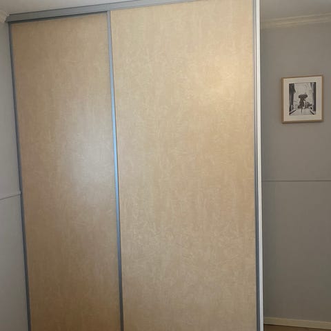 Pent brukt skyvedørsgarderobe med hvite glassfronter