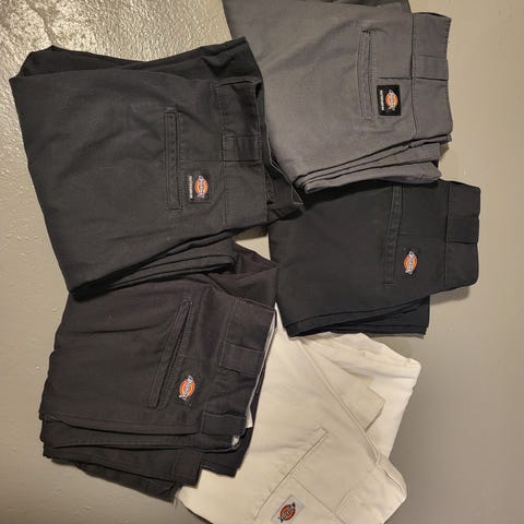 Selger et par svarte Dickies Loose Fit bukser i waist size 26. Klassisk modell med rett passform og slitesterkt stoff, kjent for komfort og holdbarhet.