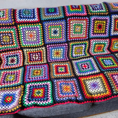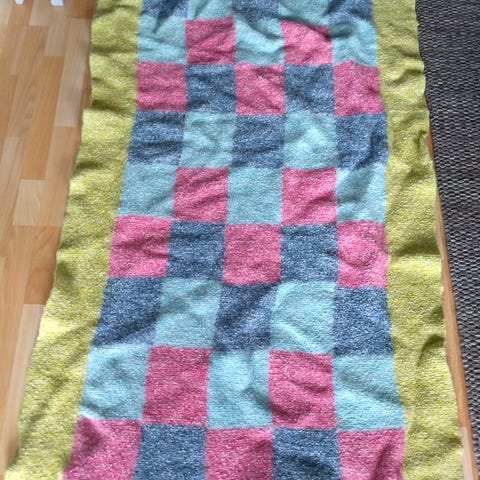 Håndlaget ullteppe i bestemorruter med mål 90x125 cm. Teppet er flerfarget med en kombinasjon av ulike farger som gir et livlig og tradisjonelt utseende. Laget av ull, noe som gir god varme og komfort. Ideelt som et dekorativt element i stuen eller soverommet.