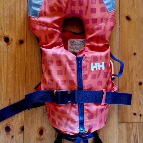 Redningsvest til barn. God vest som barna ikke protesterer mot å bruke. Har også størrelsen større som straks er for liten. Brukt i saltvann, men skylt etter bruk og oppbevart tørt. Alle deler er intakt. Inkludert skrittstropper.