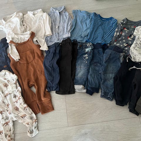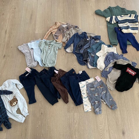 Klespakke i str.80 inneholder totalt 14plagg. Ensfargede bodyer fra carter’s, hund-body fra lindex, skjortebody fra newbie, gensere fra h&m, peppa gris klær fra sparkjøp, pyjamaser fra kappahl, dongeri?. Peppagris sett er ubrukt, kun vasket. Gensrene er kanskje brukt 1 gang hver, bodyene et par ganger. Pyjamasene er godt brukt, men hele og fine, en flekk på den turkise (se bilde). Desse er i str 74/80, men er store i str. Selges samlet til 250kr (tilsvarer 17,8kr per plagg)