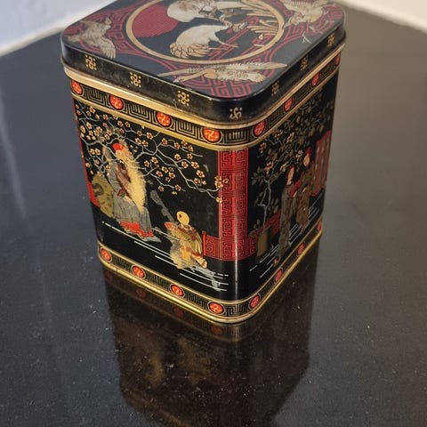 Søkeord: vintage teboks metallboks engelsk boks eldre orientalsk dekor asiatisk design retro oppbevaringsboks samlerobjekt te container samle samling kinesisk svart sort rød rødt gullfarget Blikkskrin blikkboks metallboks kakeboks skrin ekse boks spann blomster blomst lokk tre