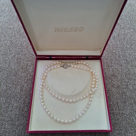 Perlekjede bestående av 108 stk kulturperler og lås av ekte gull fra norske Van Bergen. Kjedet er helt ubrukt, og leveres i original boks. Perlene er meget pene, da det ikke er noe slitasje fra bruk. Kjedet er taksert av gullsmed og autorisert takstmann, datert 11.08.25. Verdi: 25.000. Bud tillates.