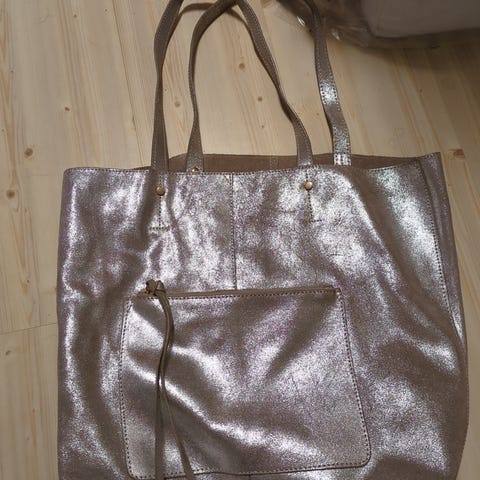 Stor sort skulderveske kjøpt på Ordning Reda for mange år siden, men har vært lite i bruk de senere årene. Ikke skinn, men materiale som virker sterkt og tåler vann. Den har en lomme bak. Inni har den et midtrom og innerlomme. Den er 50 cm bred, ca 33 cm høy uten stroppene og 15 cm bred i bunnen. Klarer å få den inn i liten pakke uten at den ødelegges.