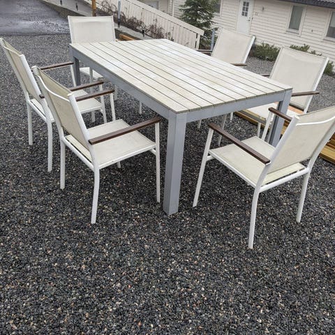 Selger 2 stk piknikbord / sittegruppe med benk. Sittebenkene kan vippes opp.