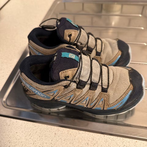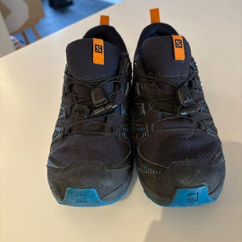 Salomonsko i Goretex, vanntett overgangssko som passer like godt til hverdags og som på tur. Godt alternativ til Viking. Noen små bruksmerker på tuppen etter lek og aktivitet.