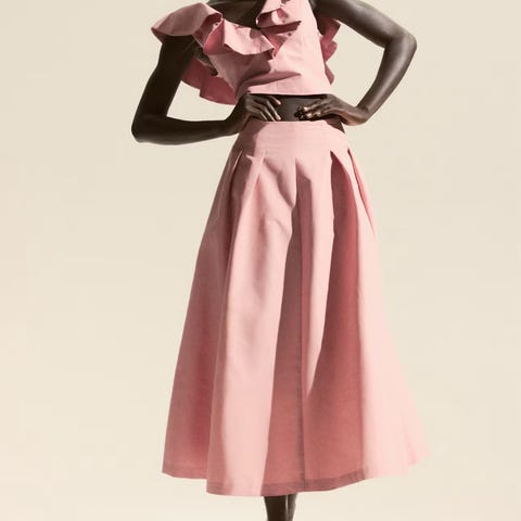 Et maxiskjørt i krinklet chiffon med høy midje og skjult glidelås og hektelukking pả den ene siden. Ledig passform. Kort underskjørt i trikot.